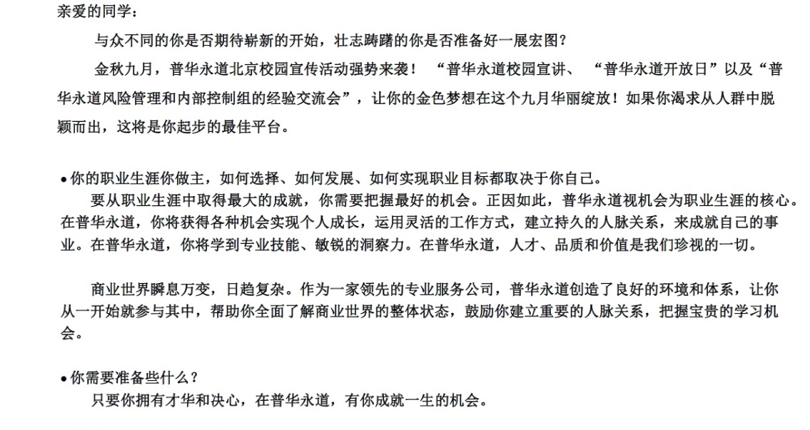2014~2015年度普华永道校园招聘全线火热展开!普华永道校招职位说明:ww***com[点击查看]全国各地高校校园宣讲日期安排:ww***com[点击查看]网申链接:ww***com[点击查看]期待在普华永道遇到你!普华永道校园招聘组