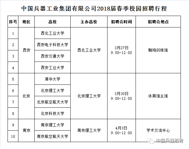 中国兵器工业集团有限公司2018届春季校园招聘工作正式启动。从3月27日到4月3日,我们将在西北工业大学、北京理工大学、南京理工大学3所高校举行大型专场招聘会,只为找到合适的彼此。