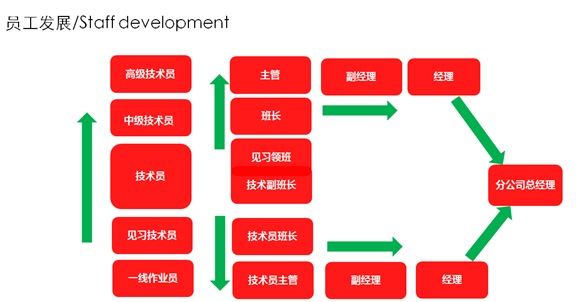 二、 培养计划、职业发展 1、培养计划:实习期将有经验丰富的导师一对一进行辅导,完整地学习产品和工艺、工作流程、6S、产品构造、机器调试等基本技能,实现从操作到技术的跨越。 2、职业发展和晋升通道(企业自主评价) 公司为所有员工提供技术、管理的职业发展双通道,具备管理潜质的人才在经过现场工艺技术的锻炼可通过竞聘上岗,担任组长、班课长,往中高层管理发展。 公司对于技术类人员非常重视,提供非常完整和健全的职业发展通道和晋升机制。