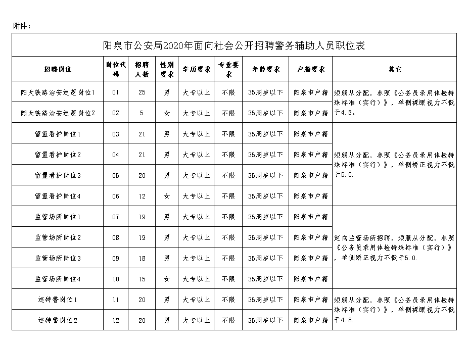阳泉市公安局共计划招聘警务辅助人员215名,具体为:阳大铁路治安巡逻岗位30名(含女性5名),留置看护岗位74名(含女性12名),监管场所岗位71名(含女性15名),巡特警岗位40名。