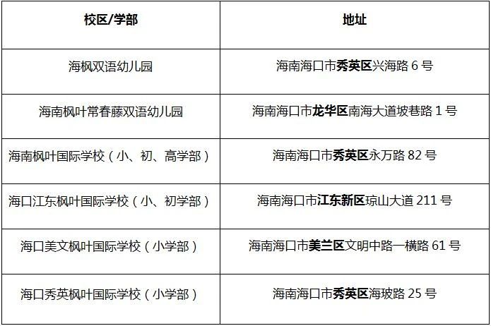 2017年2月枫叶教育集团并购海南国科园实验学校,更名海南枫叶国际学校。2018年1月枫叶教育集团并购4所美舍系列学校后,当年6月成立了海南枫叶教育大区,成为海口当地规模突出的K12一贯制教育机构。大区现有2所幼儿园、4所小学、2所初中、两种高中(国内高中和国际高中),教职员工900余人,其中一线教师440余人,含外籍教师约30人。现有全日制在校生7000多人,其中外籍和港澳台学生40余人。