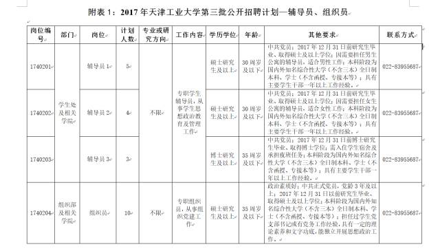 公开招聘方案在天津工业大学门户网站(ww***.cn[点击查看])公开招聘专栏发布。具体招聘岗位见《2017年天津工业大学第三批公开招聘计划—辅导员、组织员》(附表1)