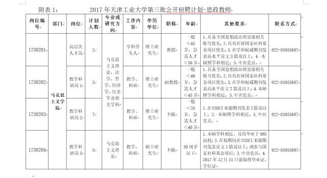 公开招聘方案在天津工业大学门户网站(ww***.cn[点击查看])公开招聘专栏发布。具体招聘岗位见《2017年天津工业大学第三批公开招聘计划-思政教师》(附表1)。