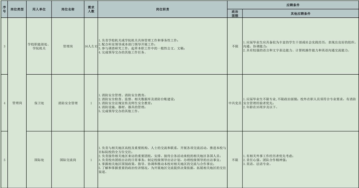 管理岗位:18人左右(以学校职能部处、学院机关管理岗位为主)