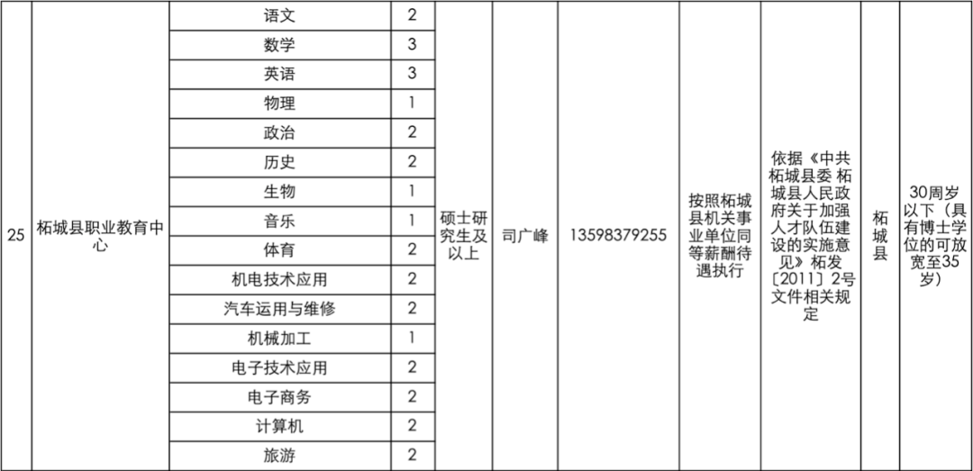?招录高中教师30名,其中:语文2名、数学3名、英语3名、物理1名、政治2名、历史2名、生物1名、音乐1人、体育2人、机电技术应用2人、汽车运用与维修2人、机械加工2人、电子技术应用2人2电子商务2人、计算机2人、旅游2人。